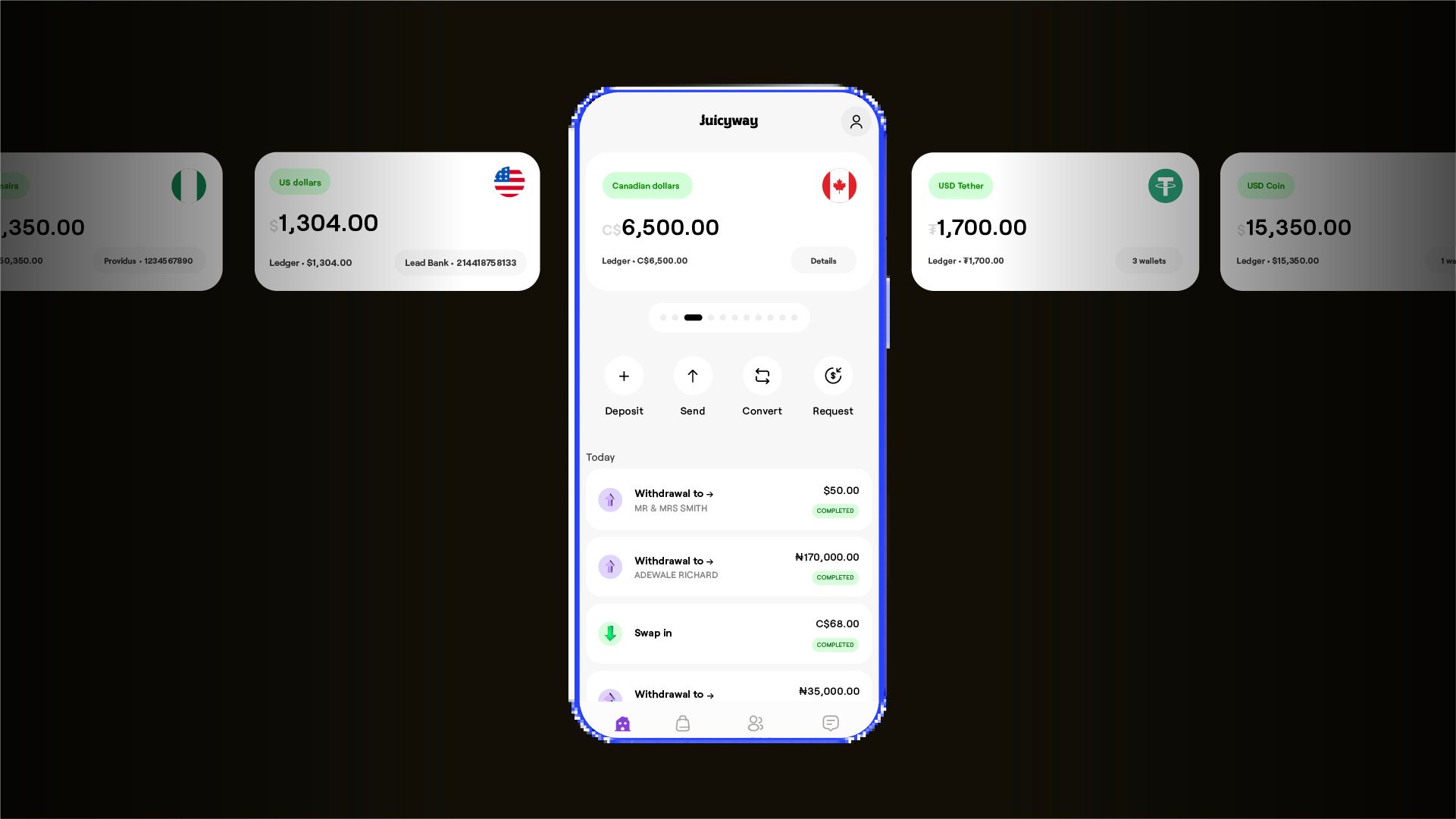 Juicyway allows you to operate multi-currency accounts on the platform. You can receive or make payments in NGN, USD, EUR, CAD, or GBP. You can also use Juicyway to transact with crypto and convert money from one currency to another. The platform provides comprehensive solutions for international payments, making it the most convenient platform for local and international transactions.