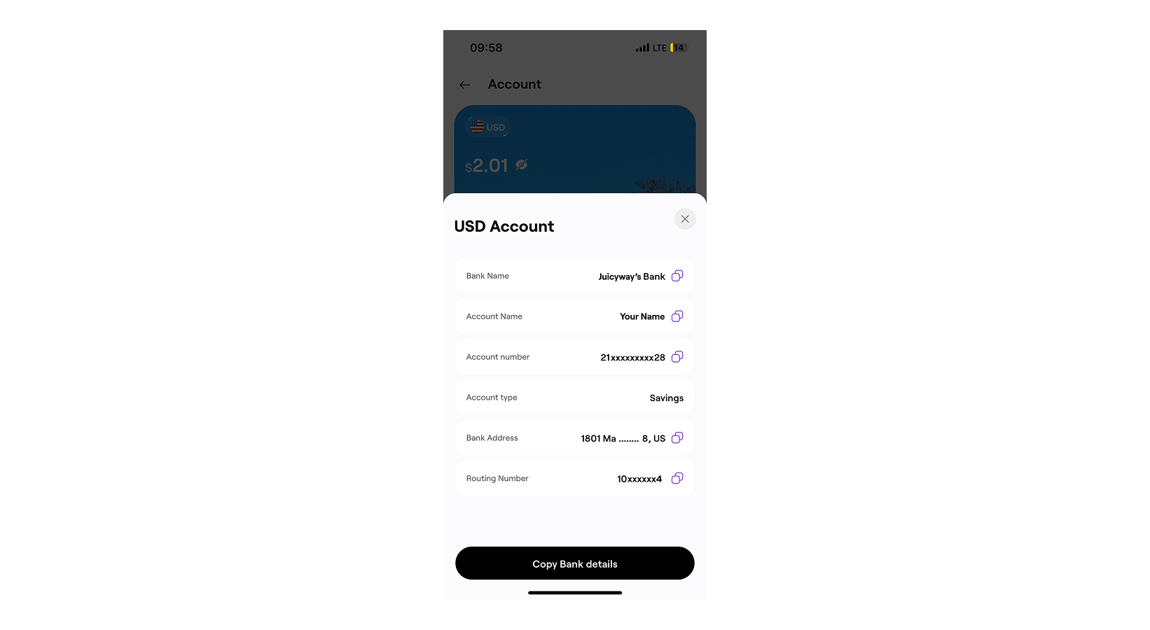 - Once verified, you’ll be assigned a unique USD account number and bank details.