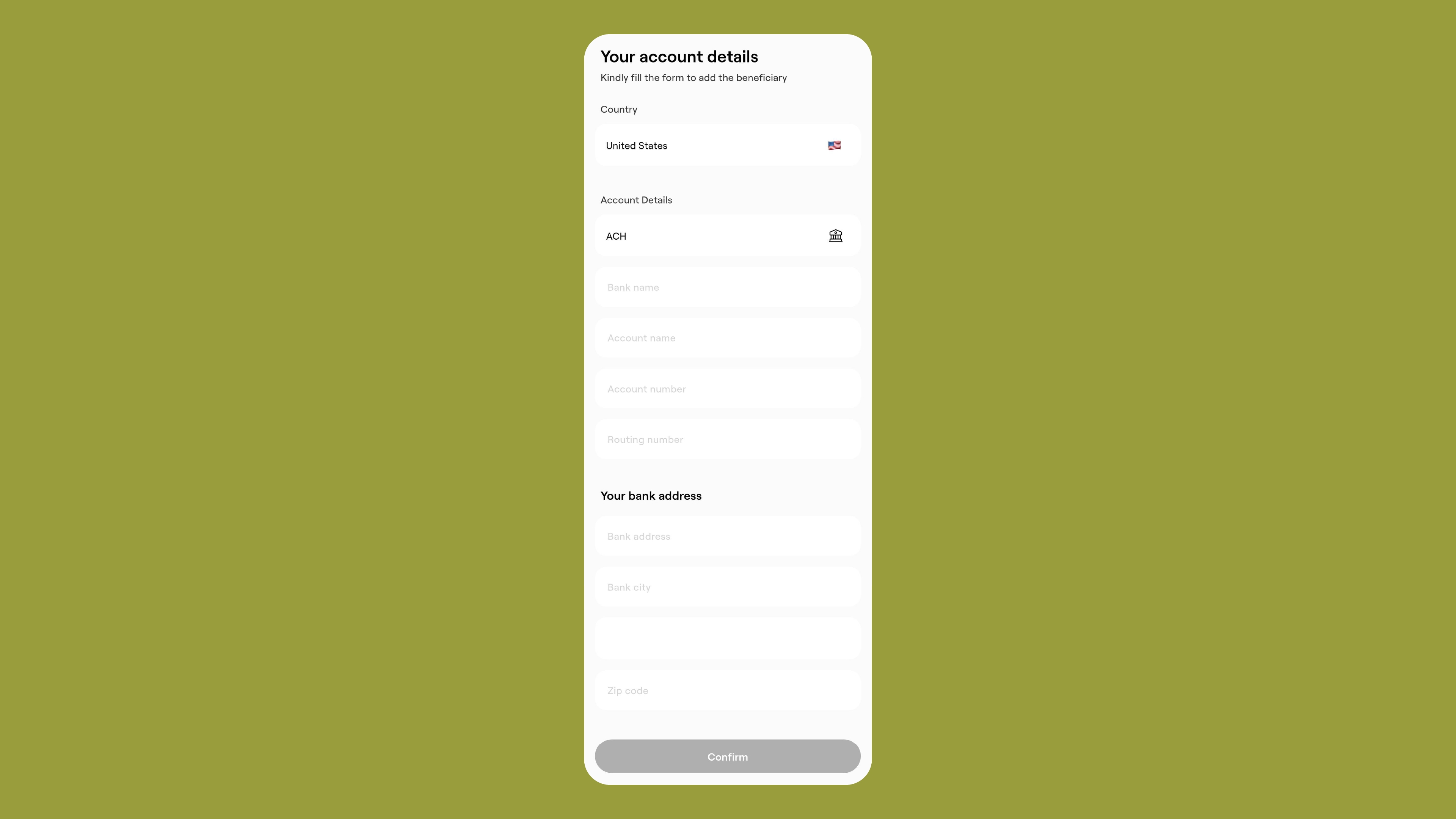 - Transfer type: ACH or Fedwire (for personal accounts, business accounts can select SWIFT)