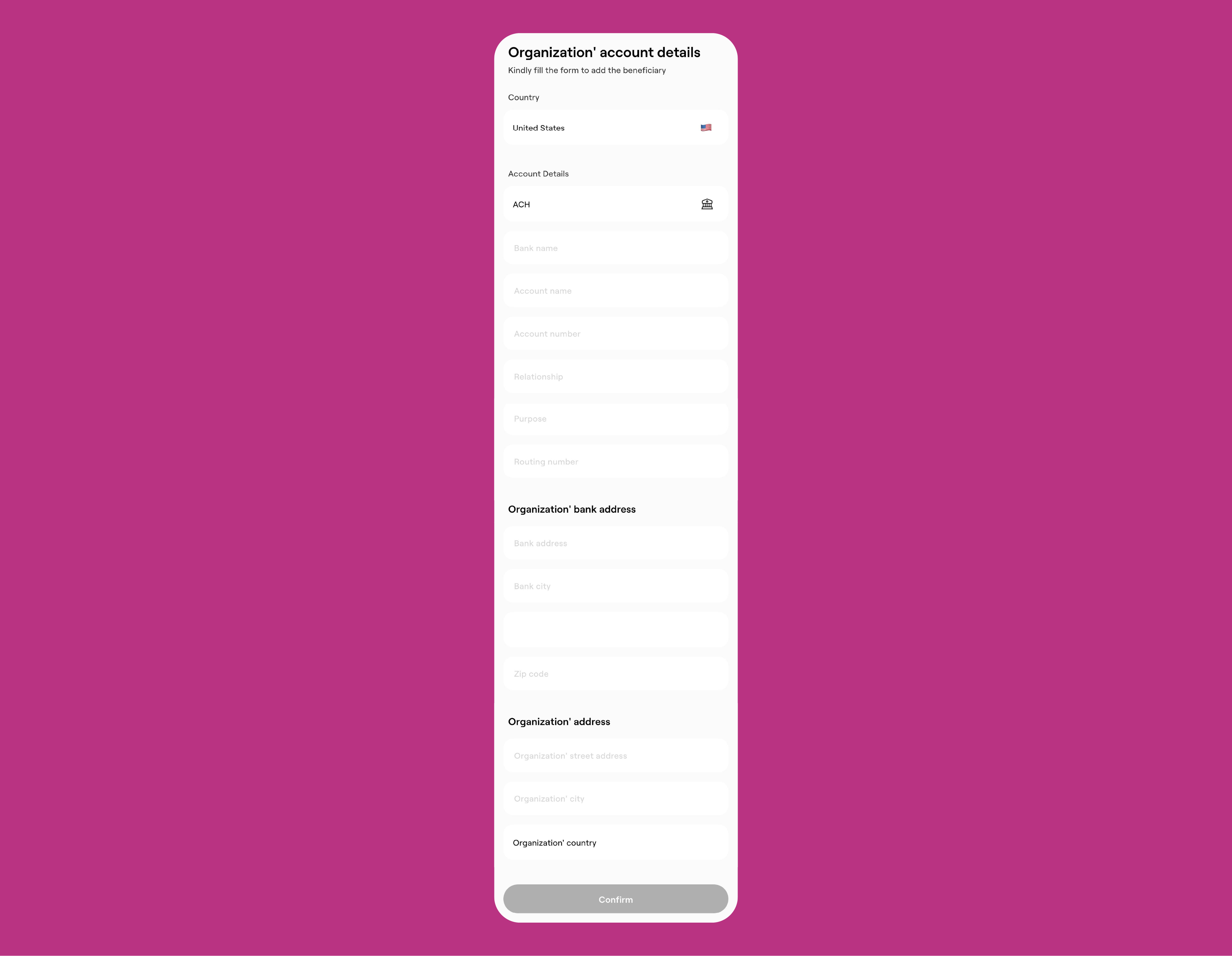 - Choose ACH for standard transfers or Fedwire for urgent ones.