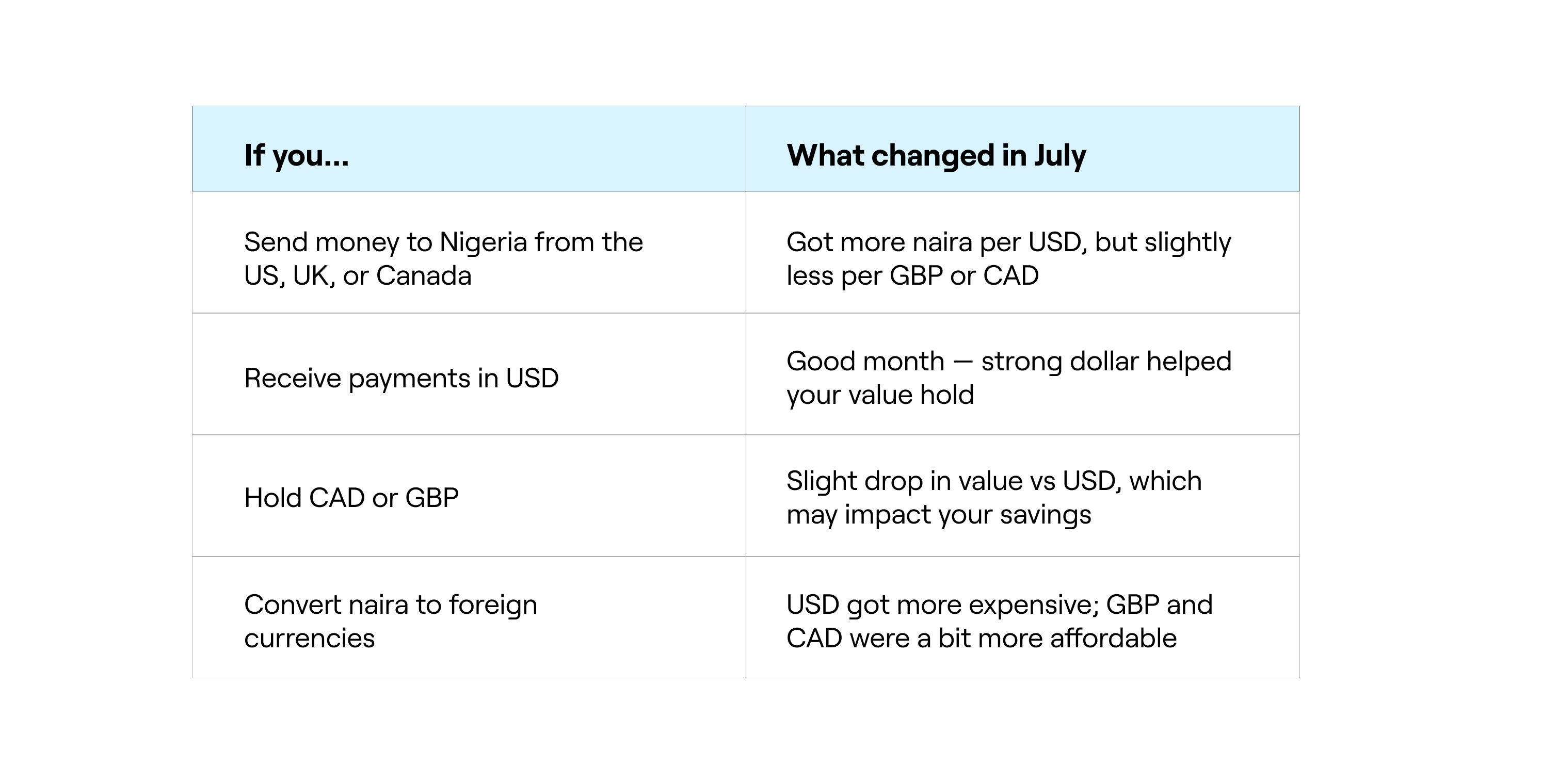 The naira stayed relatively stable in July, trading between ₦1520–₦1570 per USD in the parallel market for most of the month.